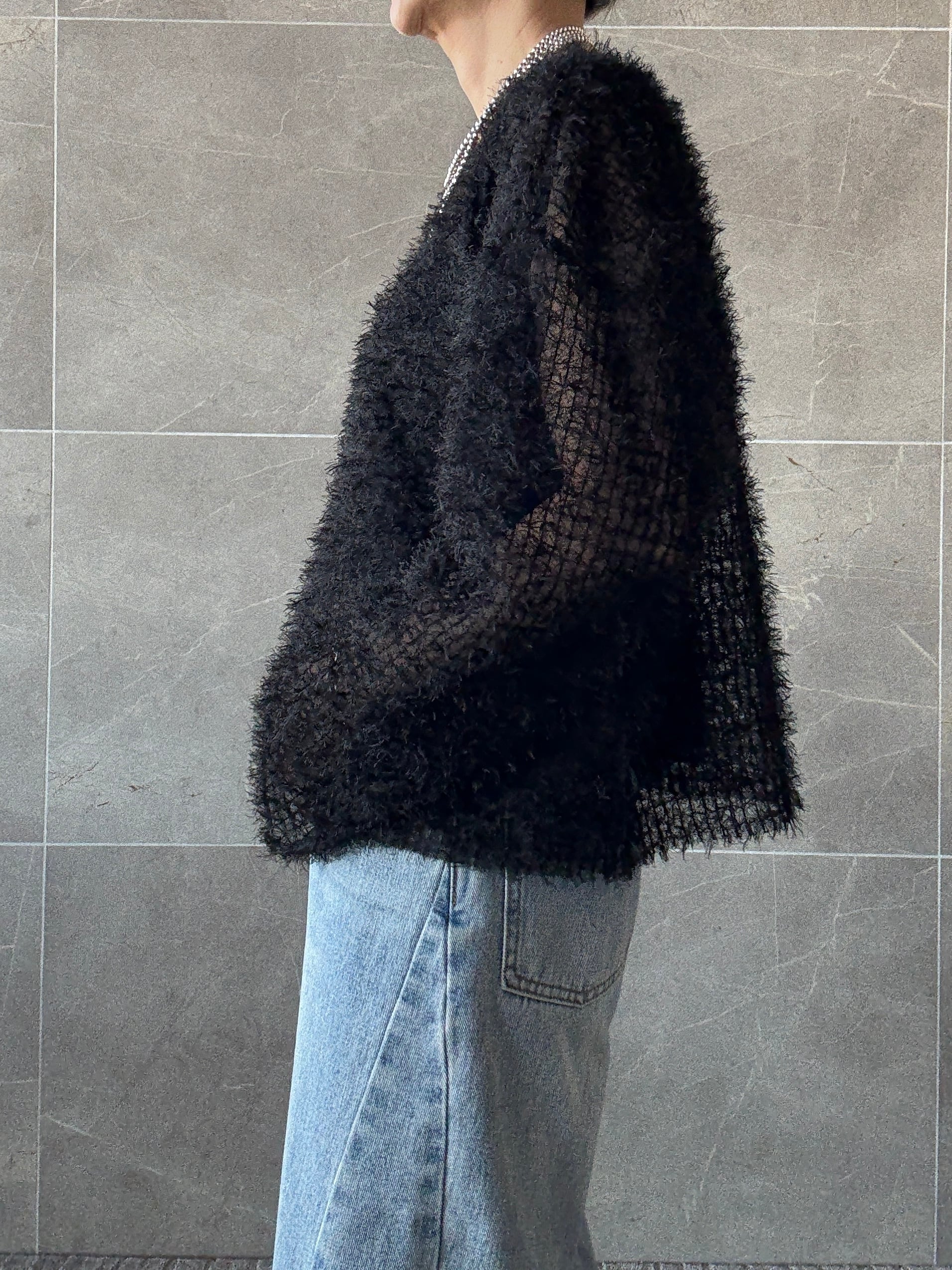 立体的で表情のある素材で、チュールの透け感に今年らしいフェザーが上品に施されたプルオーバー。