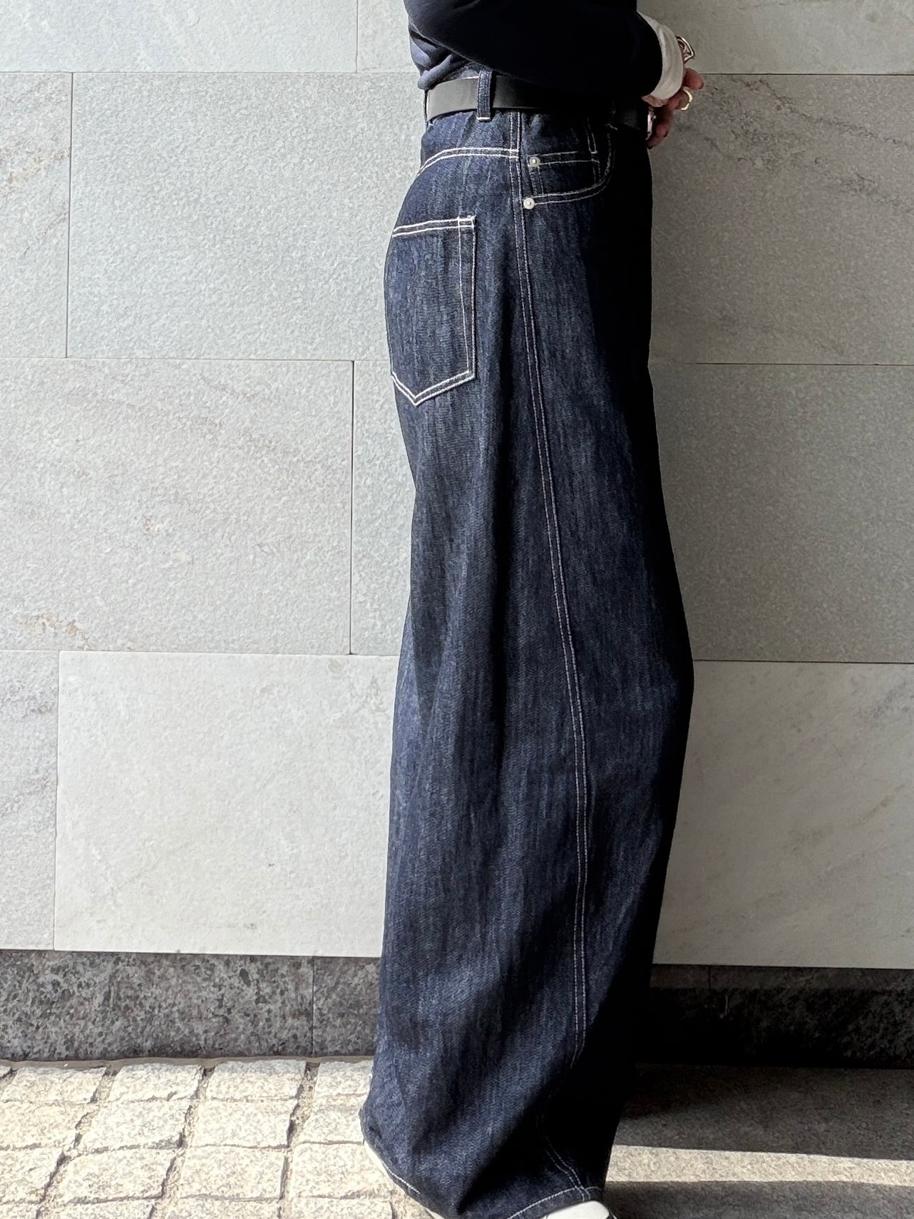 ホワイトステッチが描くラインはデニムに軽やかな抜け感と清潔感、そして上品さをプラス。