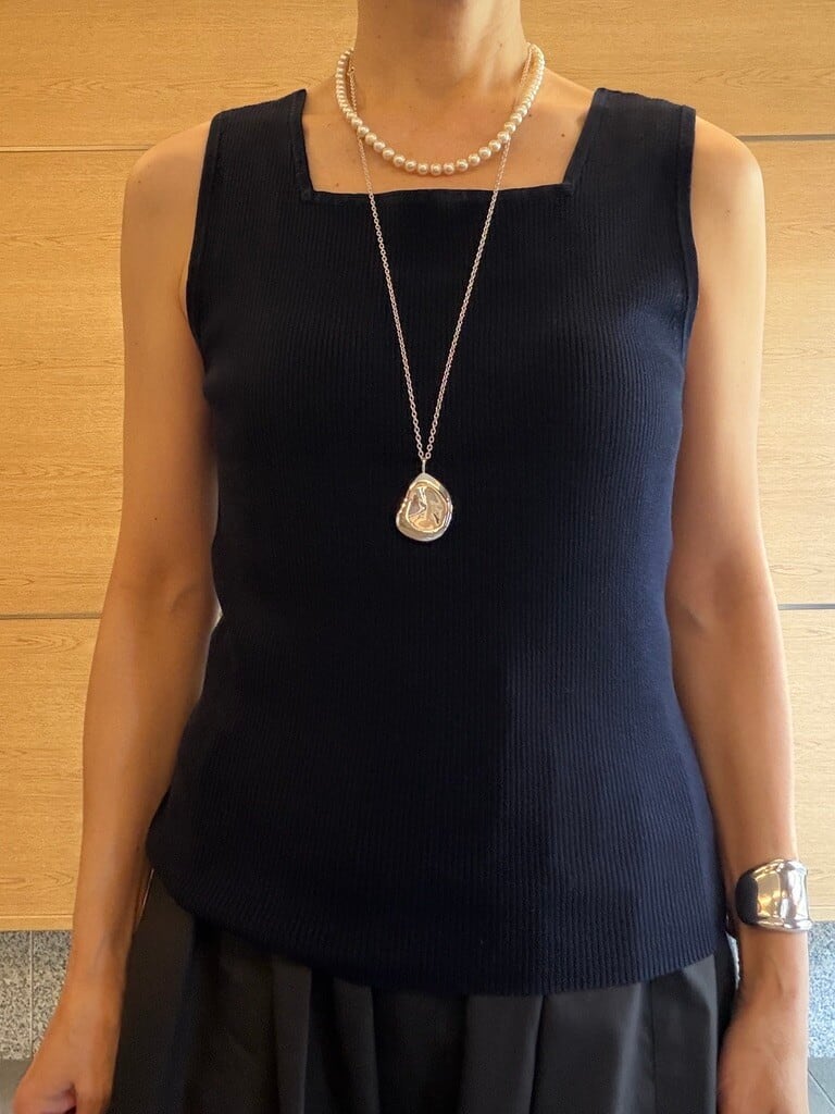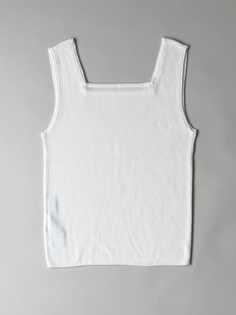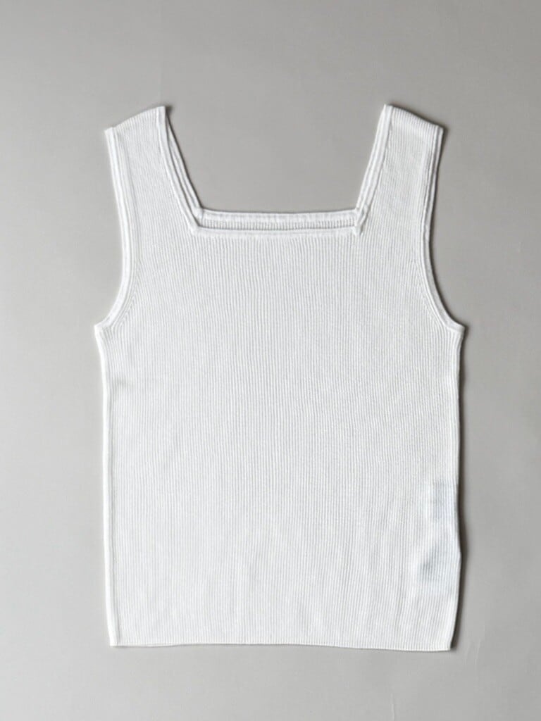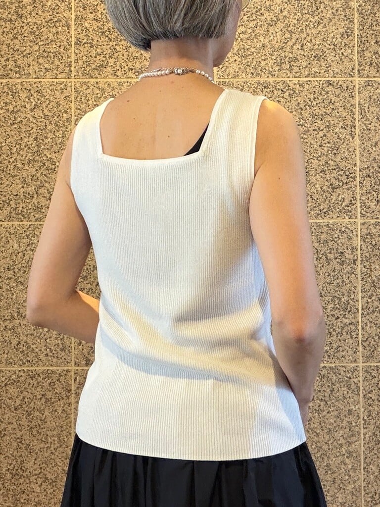デコルテを美しく見せるスクエアネックデザイン、ニット素材タンクトップ。
