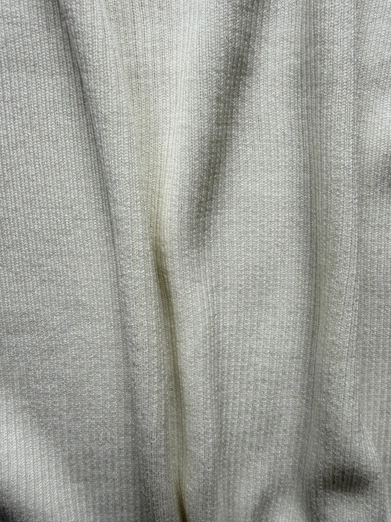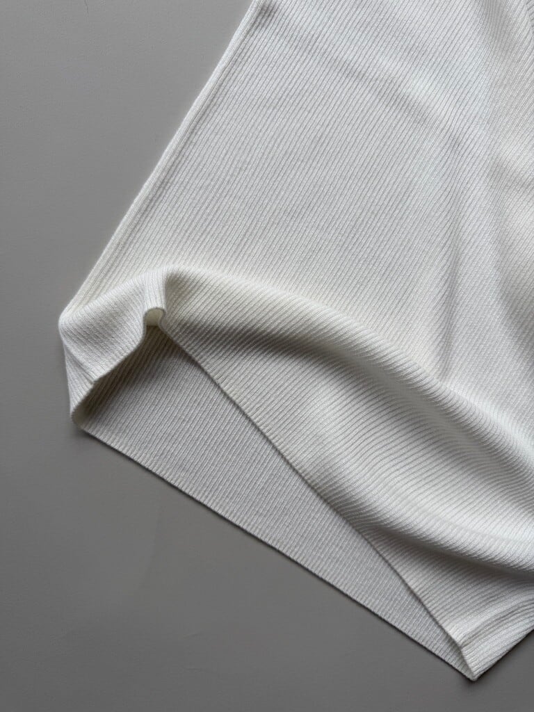細番手のリブ編みは適度な厚みがある為、程よいタイトフィットでも身体のラインを拾いづらく安心感ある一枚。