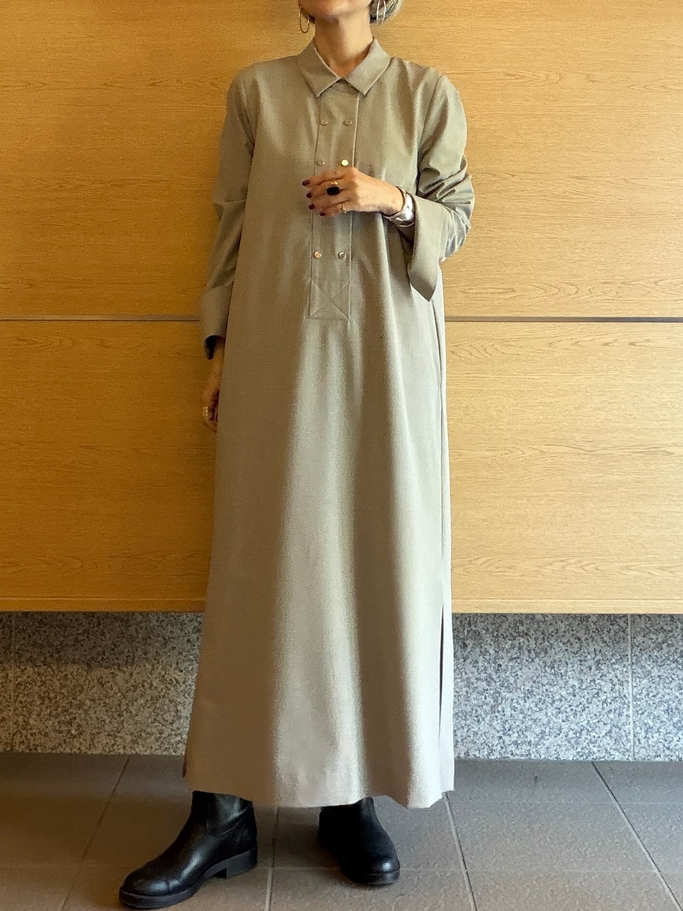 ストレートシルエットのハンサムワンピースは、綺麗めながら少しモード感を感じる「小慣れデザイン」。