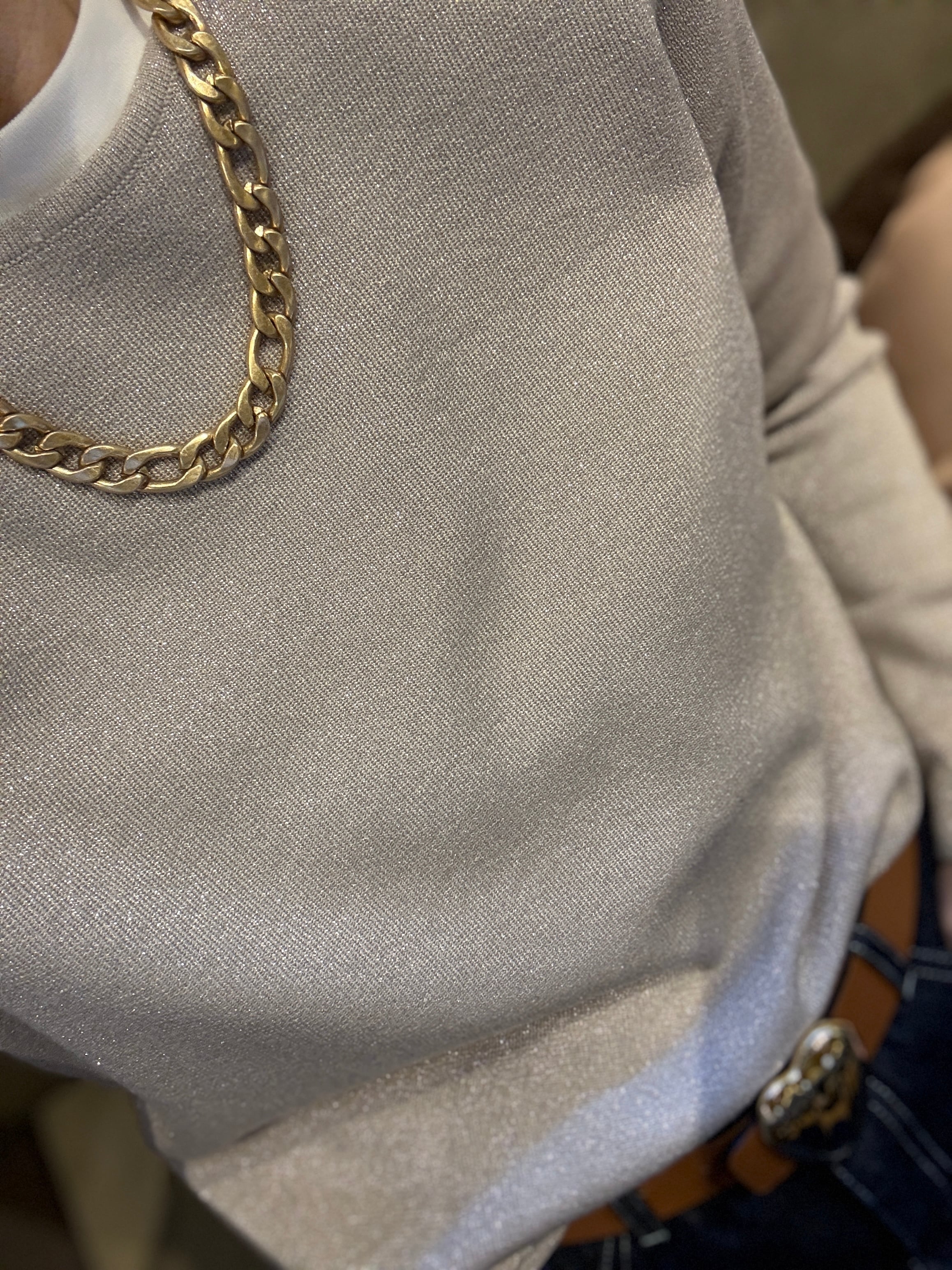 伸縮性あるカットソーの様なゴム編みと柔らかいレーヨン素材は着やすい着心地で、控えめなラメが程よい華やかさを放つニットプルオーバー。